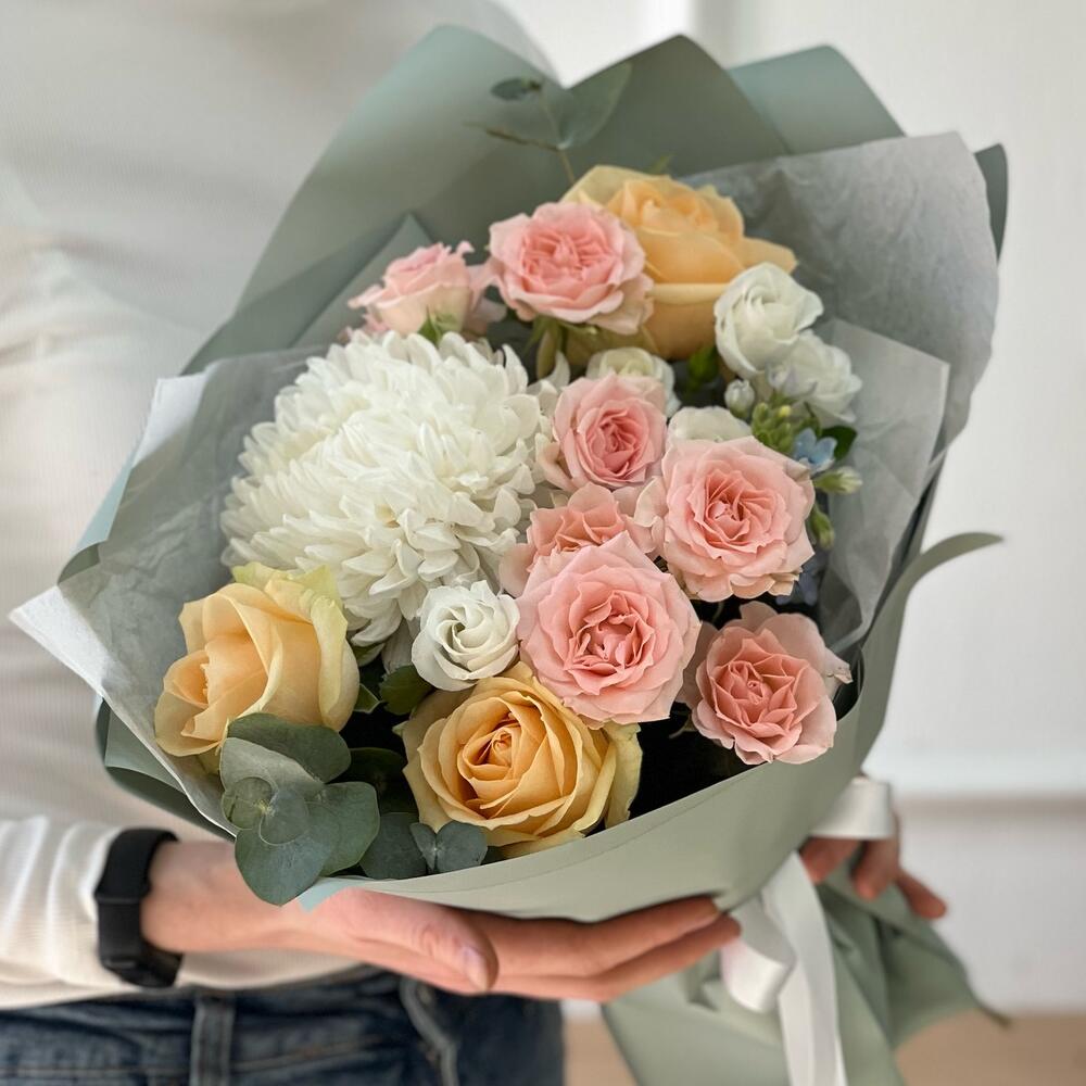 Сборный букет с одноголовой хризантемой и розами «Принцесса Нурри» 44