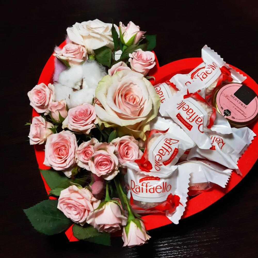 Красное сердце с нежной композицией из цветов с рафаэлло и мёдом -прекрасный подарок для девушек и женщин.Рафаэлло безусловно одна из самых желанных конфет на все времена.А свежие цветы для девушек и женщин -это всегда, радость и счастье.Побалуйте своих близких. ❤