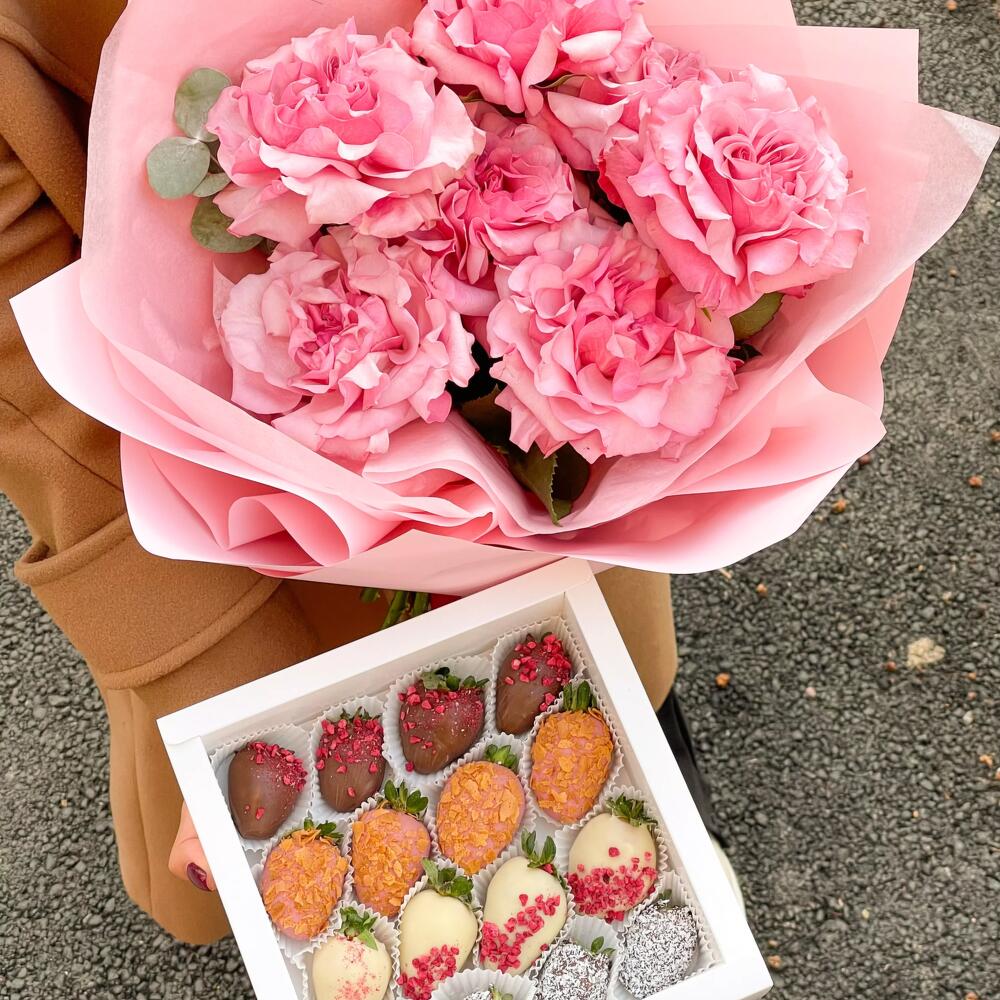 Роза – 7 шт. Клубника в шоколаде – 16 шт.