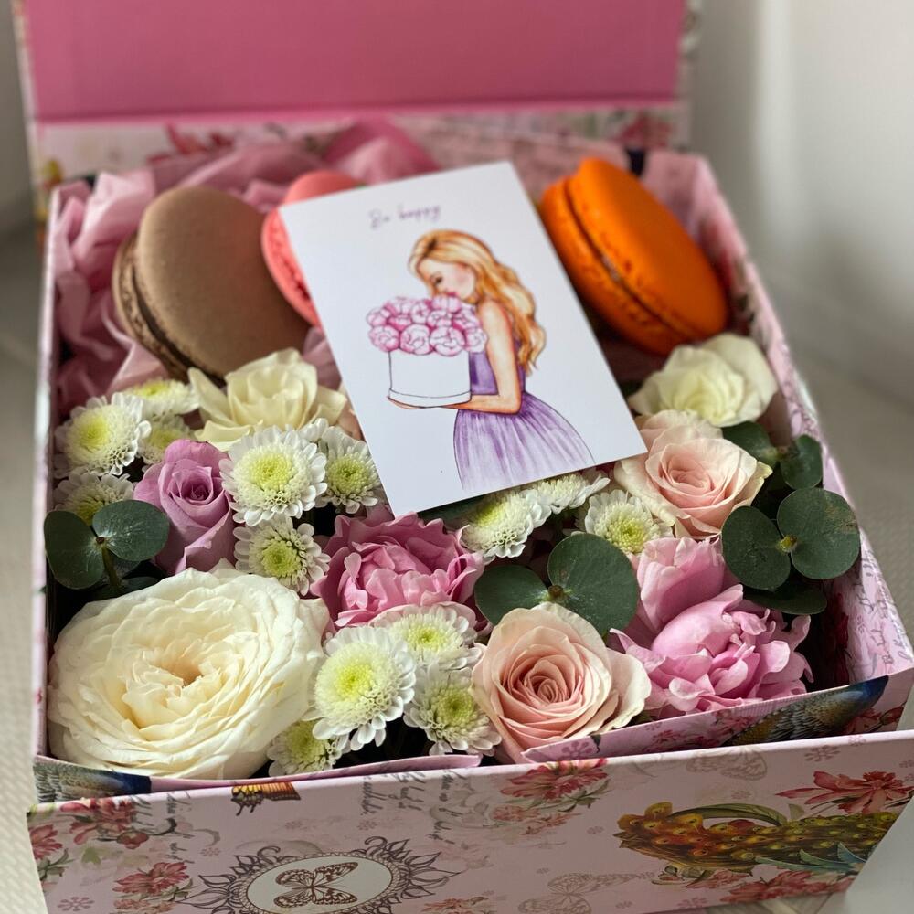 Кустовая роза – 1 шт.Зелень – 1 шт.Гвоздика – 1 шт.Оазис – 1 шт.Коробка – 1 шт.Макарон – 4 шт.Одноголовая роза – 5 шт.