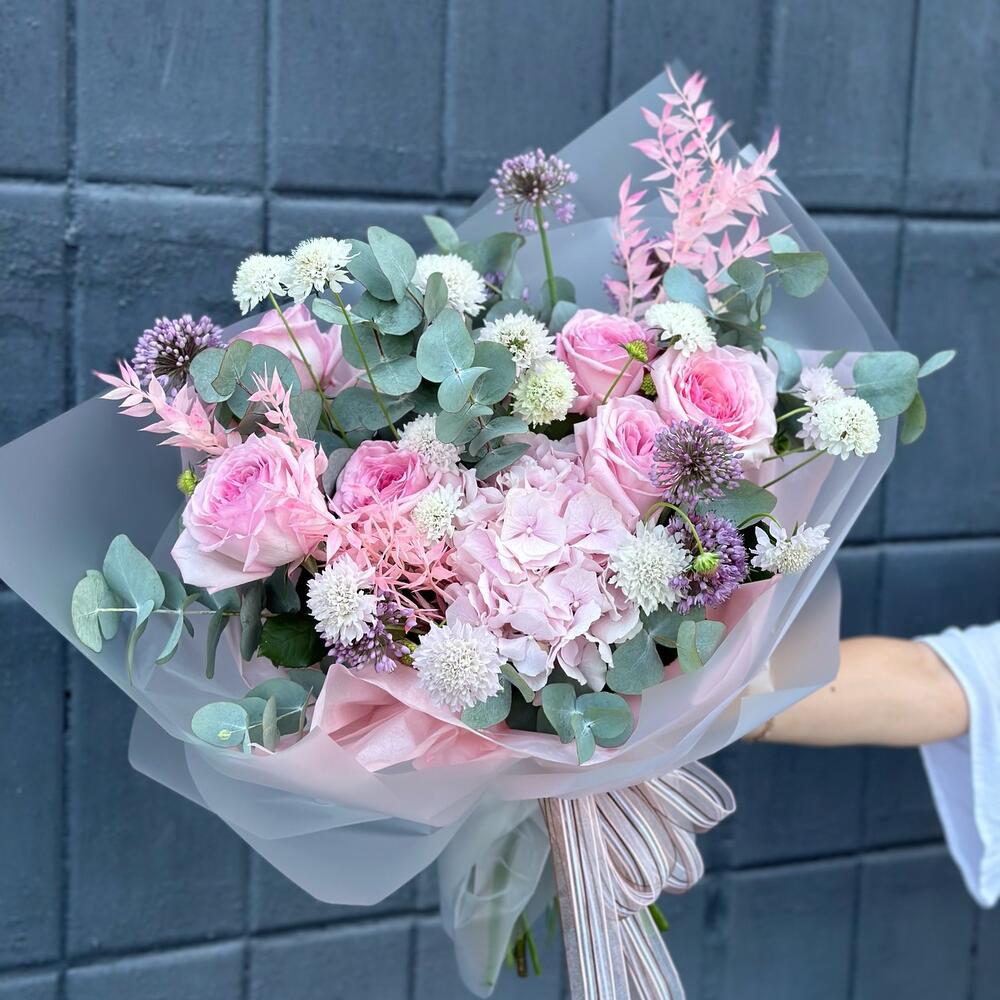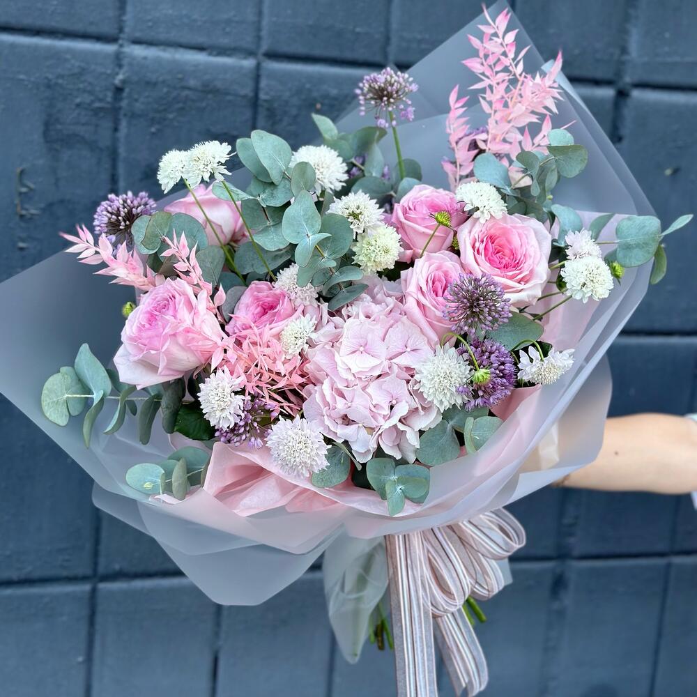 Эндорфин (пионовидная роза, эрингиум и эвкалипт)