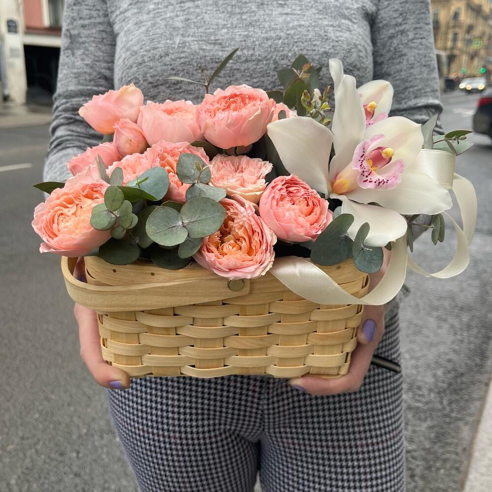 роза премиум пионовидные джульетта нежно-розовая – 4 шт.Эвкалипт – 3 шт.удлинитель для орхидеи – 2 шт.Орхидея Цимбидиум белая – 2 шт.Корзина плетеная – 1 шт.Оазис флористический – 1 шт.Лента атласная – 1 шт.