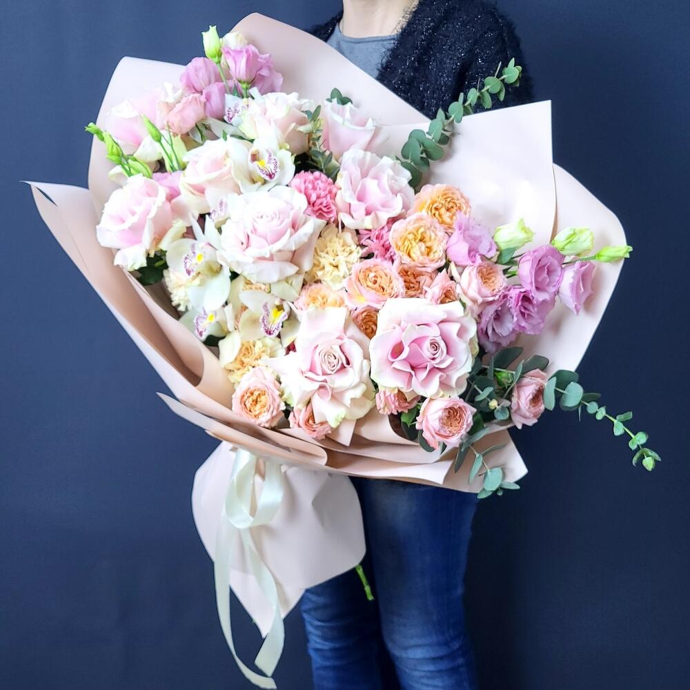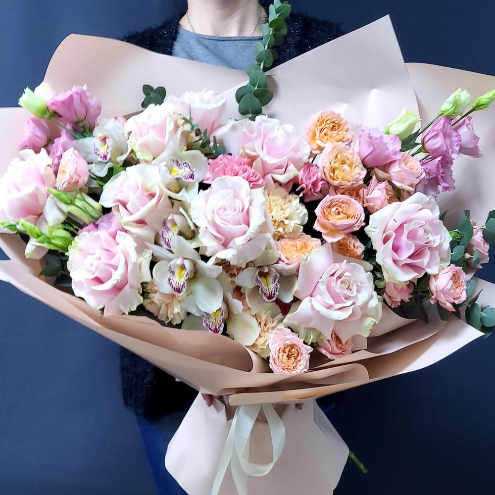 Лизиантус – 5 шт.Эвкалипт – 5 шт.Роза – 9 шт.Гвоздика – 8 шт.Фисташка – 7 шт.Роза пионовидная – 5 шт.Упаковка дизайнерская – 1 шт.орхидеи цимбидиум (бутон) – 6 шт.