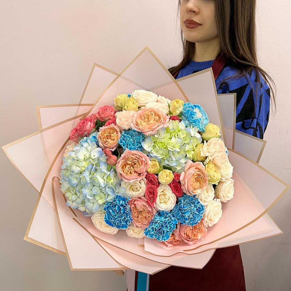 Гортензия – 2 шт.Диантус – 7 шт.Роза кустовая пионовидная – 7 шт.Упаковка дизайнерская – 1 шт.