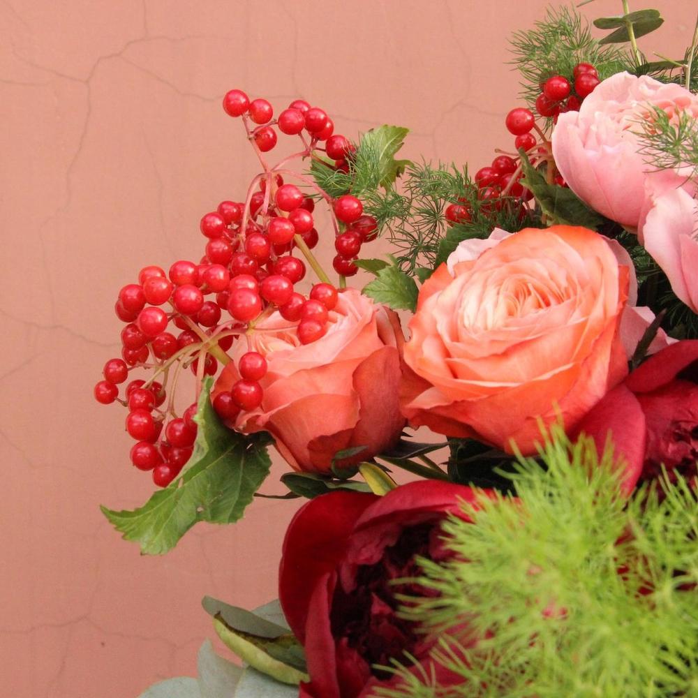 Яркий красочный букет с пионовидными розами, калиной, эвкалиптом и аспарагусом .Стильное цветочное решение для любого случая.