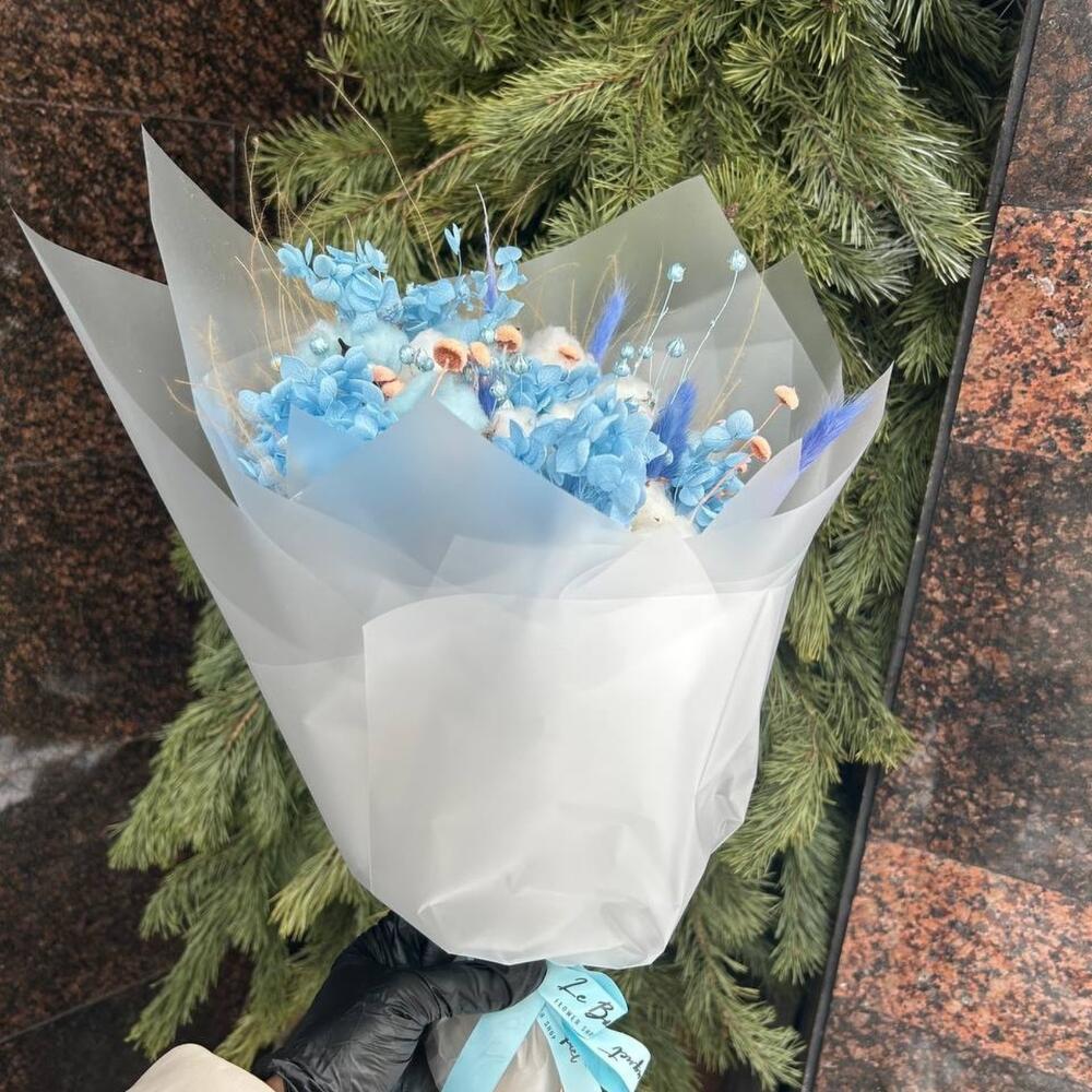 гортензия стабилизированная – 4 шт.Лагурус – 20 шт.Ковыль – 25 шт.ботао – 20 шт.Упаковка дизайнерская – 6 шт.Лента атласная – 1 шт.