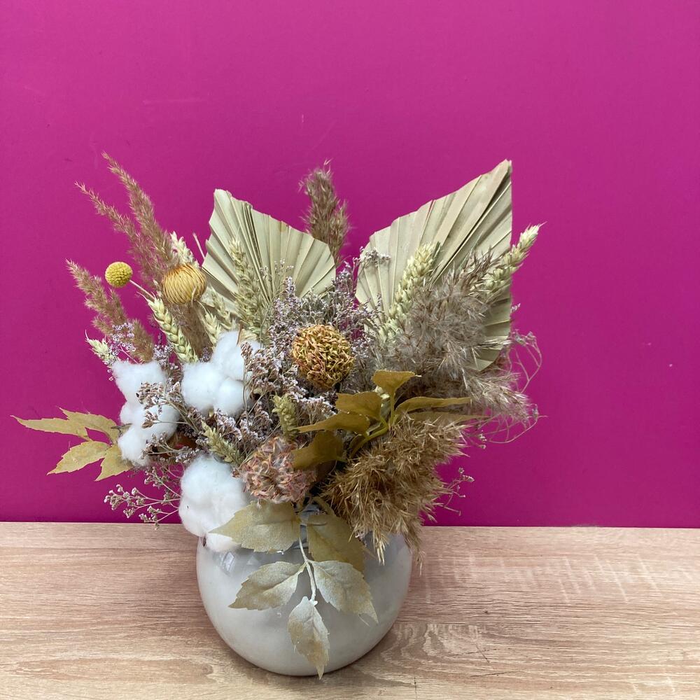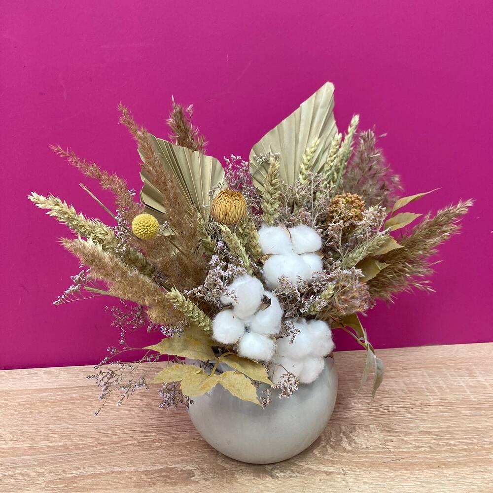 пальма стабилизированная – 2 шт.Хлопок натуральный – 3 шт.Лимониум – 5 шт.леукоспермум сухоцвет – 2 шт.Пшеница (сухоцвет) – 17 шт.папоротник искусственный – 2 шт.злаки сухоцвет – 5 шт.Оазис для сухоцветов – 1 шт.Кашпо керамическое – 1 шт.