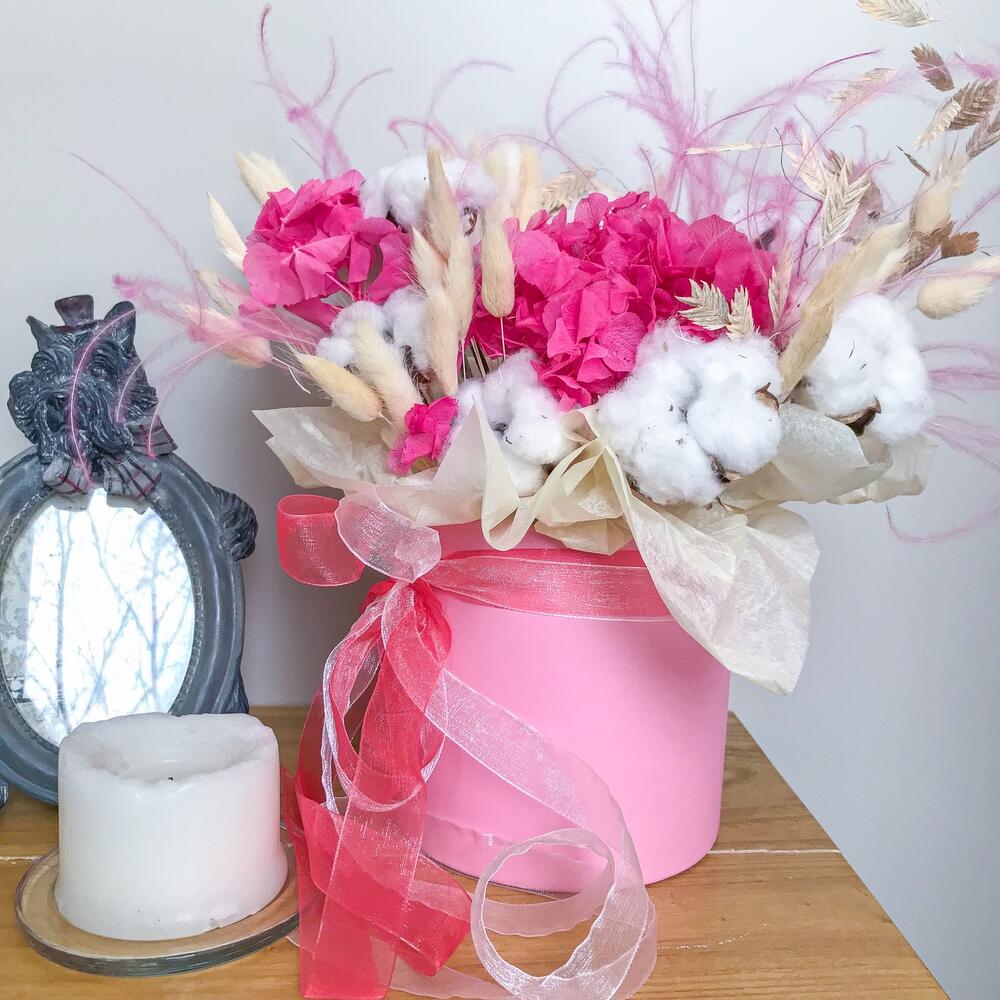 Интерьерная композиция из сухоцветов в шляпной коробке