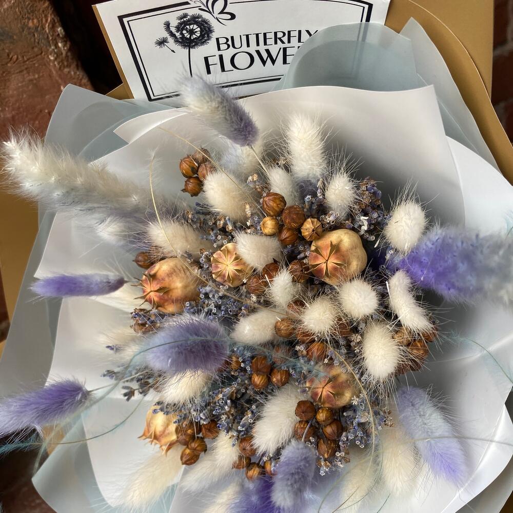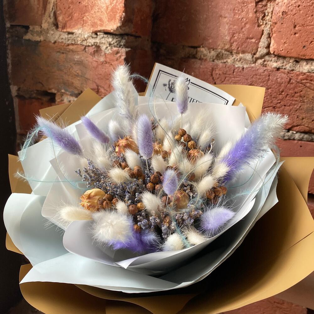 Лагурус – 40 шт.Дизайнерская упаковка пленка – 2 шт.Лента атласная – 2 шт.Лаванда (сухоцвет) – 1 шт.Лен – 3 шт.коробочки мака – 5 шт.ковыль связка – 1 шт.