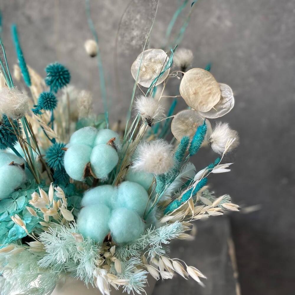 Кашпо керамическое – 1 шт.Хлопок (сухоцвет) – 5 шт.Лунария – 1 шт.аспарагус стабилизированный – 1 шт.Колоски микс – 100 шт.гортензия сухоцвет – 1 шт.