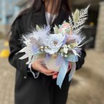 “Сиреневый туман” – композиция из гипсофилы в шляпной коробке