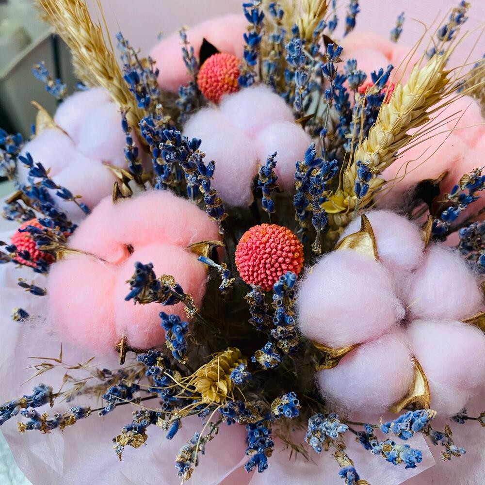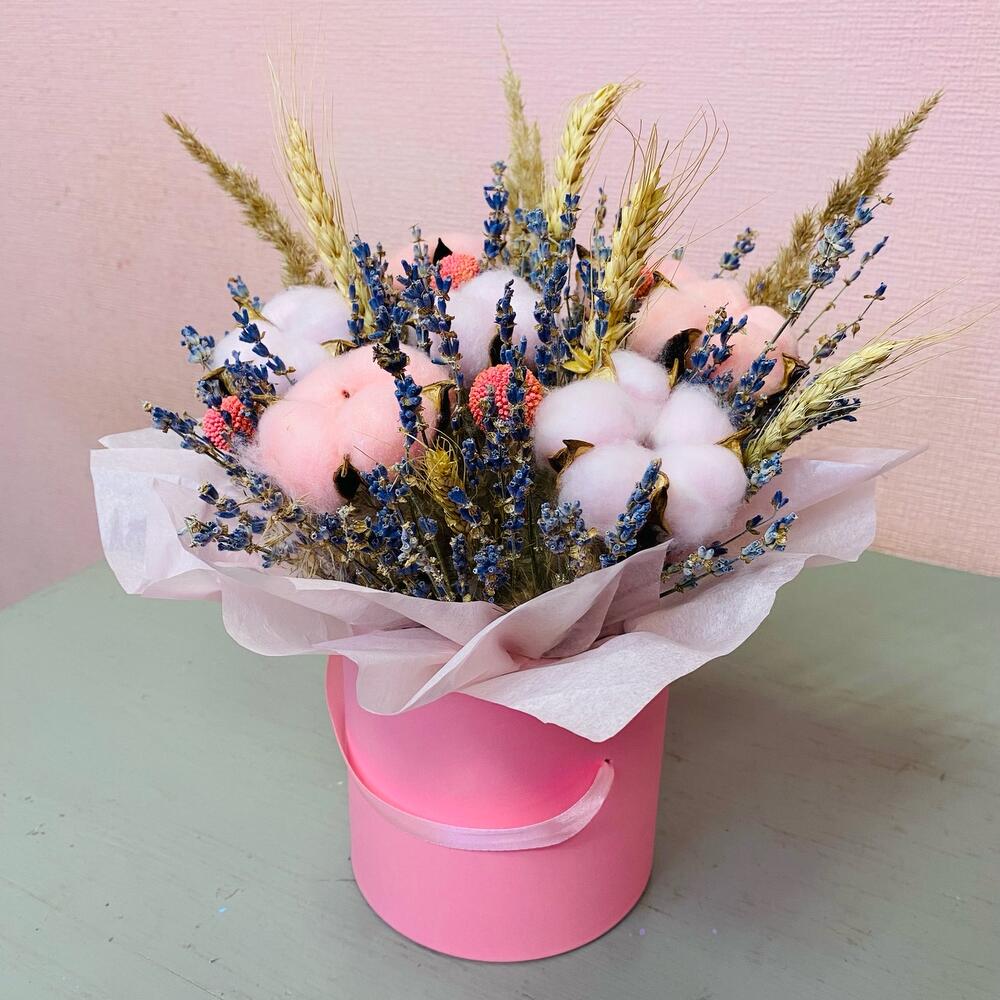 Краспедия – 4 шт.Коробка шляпная – 1 шт.Ковыль – 3 шт.Лаванда пучок – 1 шт.Оазис флористический – 1 шт.Хлопок натуральный – 7 шт.Пшеница (сухоцвет) – 5 шт.