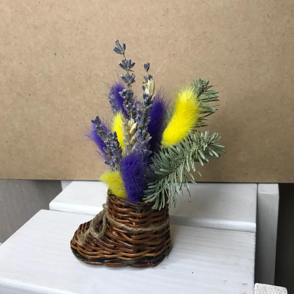 Лагурус (сухоцвет) – 8 шт.Лаванда (сухоцвет) – 6 шт.Пшеница (сухоцвет) – 2 шт.нобилис (ель голубая) – 1 шт.Корзина плетеная – 1 шт.