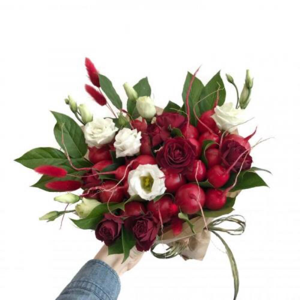 Редис – 10 шт.розы – 5 шт.Эустома – 5 шт.Лагурус – 5 шт.лавр или салал – 12 шт.