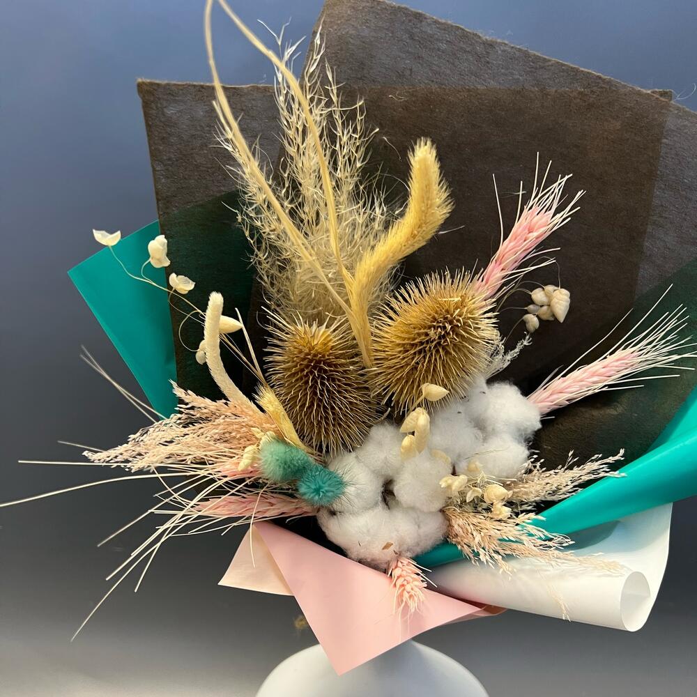 «Лавандовое созвездие» Букет из розы, гвоздики, статица и хлопка