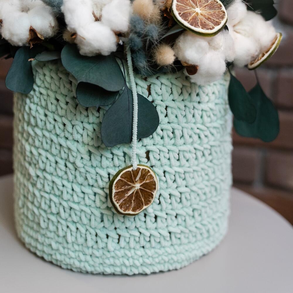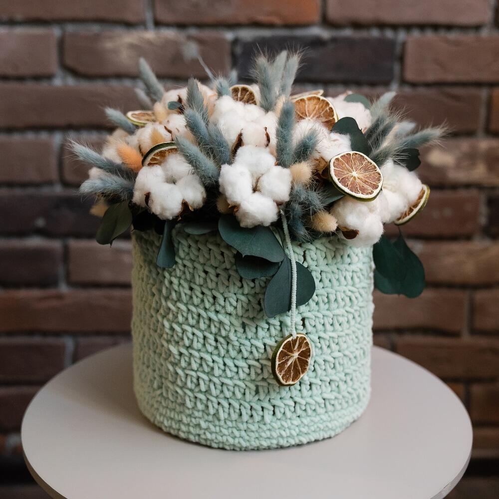 Хлопок натуральный – 25 шт.Эвкалипт стабилизированный – 3 шт.Лагурус (сухоцвет) – 30 шт.Шляпная коробка – 1 шт.дольки лайма – 15 шт.вязанка ручной работы – 1 шт.