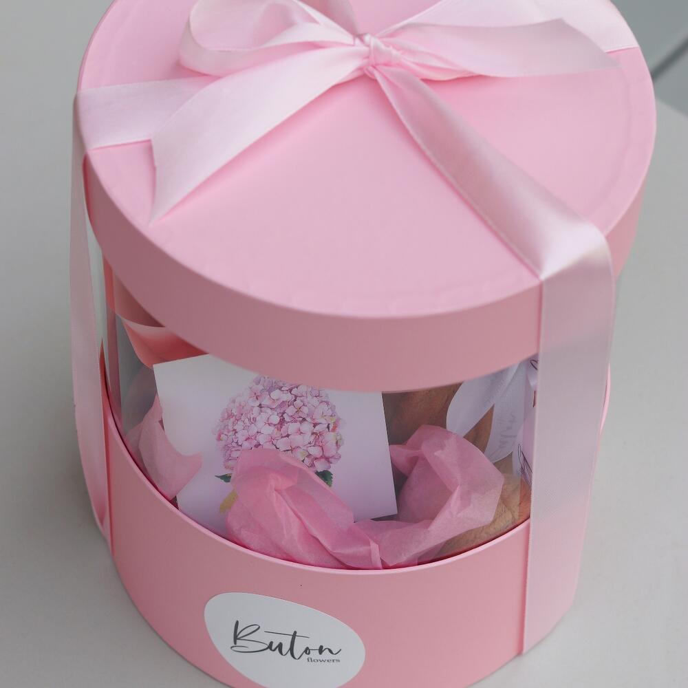 Лента атласная – 1 шт.Тишью – 1 шт.Шляпная коробка – 1 шт.Мишка плюшевый – 1 шт.Открыточка с вашими пожеланиями – 1 шт.шоколадка – комплимент для получательницы от нашей мастерской – 1 шт.букет из сухоцветов (хлопок – 1 шт.сетария) – 1 шт.