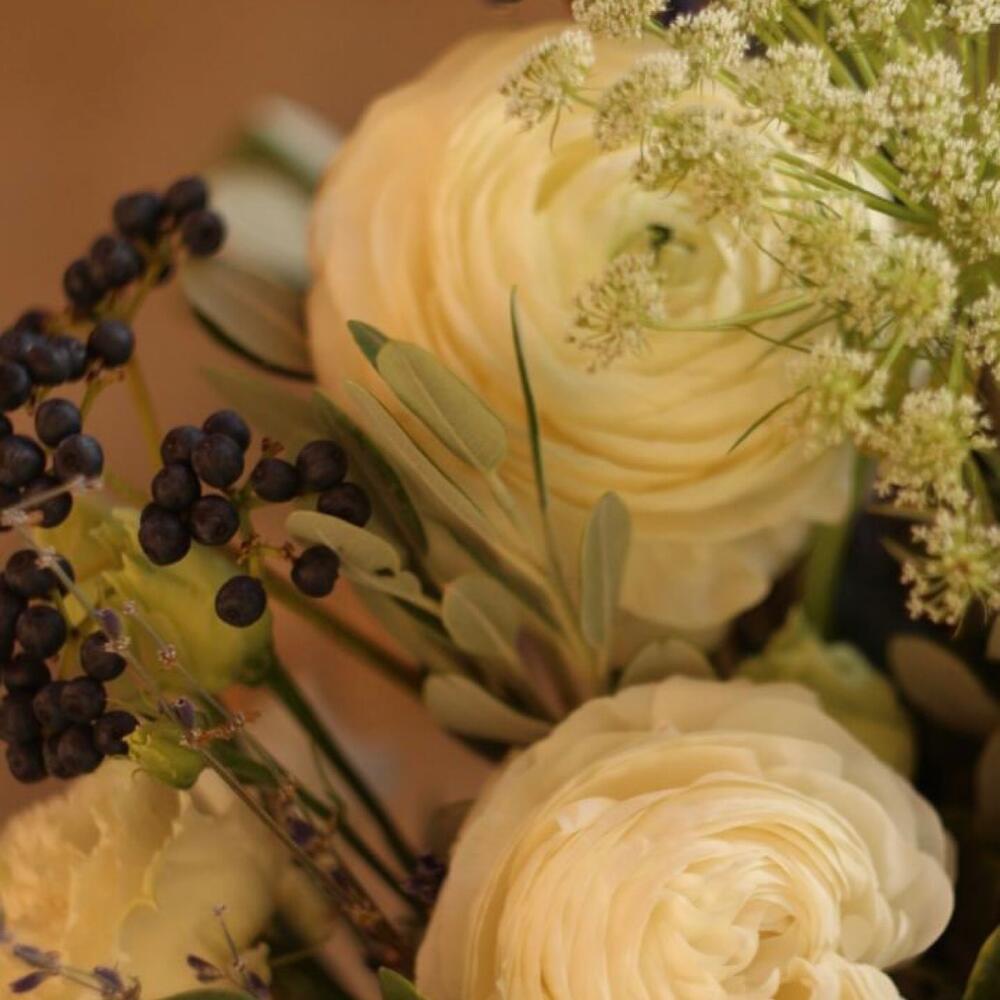 Ранункулюс – 3 шт.Лизиантус – 3 шт.Эрингиум – 2 шт.Лотос (коробочка) – 2 шт.Вибурнум ягодный – 4 шт.Амми – 2 шт.Лаванда – 15 шт.Питтоспорум – 3 шт.Лента – 1 шт.
