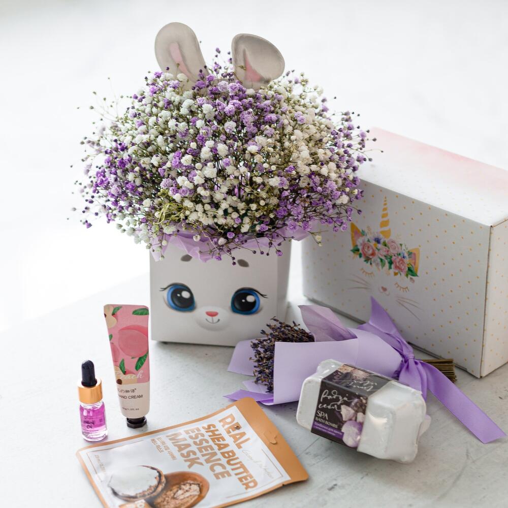 Гипсофила – 5 шт.коробка зайка – 1 шт.Тишью – 4 шт.Оазис флористический – 1 шт.маска для лица корея farm stay – 1 шт.Крем для рук – 1 шт.масло для кутикулы – 1 шт.бомбочки для ванной набор – 1 шт.Коробка подарочная – 1 шт.Наполнитель бумажный – 1 шт.Лента атласная – 1 шт.Упаковка транспортировочная пленка – 1 шт.инструкция по уходу за цветами – 1 шт.букет лаванда – 1 шт.