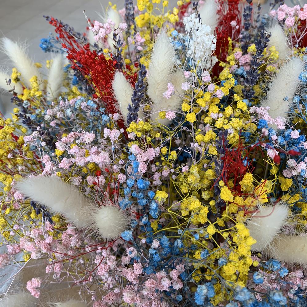 Шляпная коробка – 1 шт.Гипсофила крашеная – 15 шт.Лаванда – 20 шт.зайчики из лагуруса – 33 шт.Сухоцветы – 21 шт.