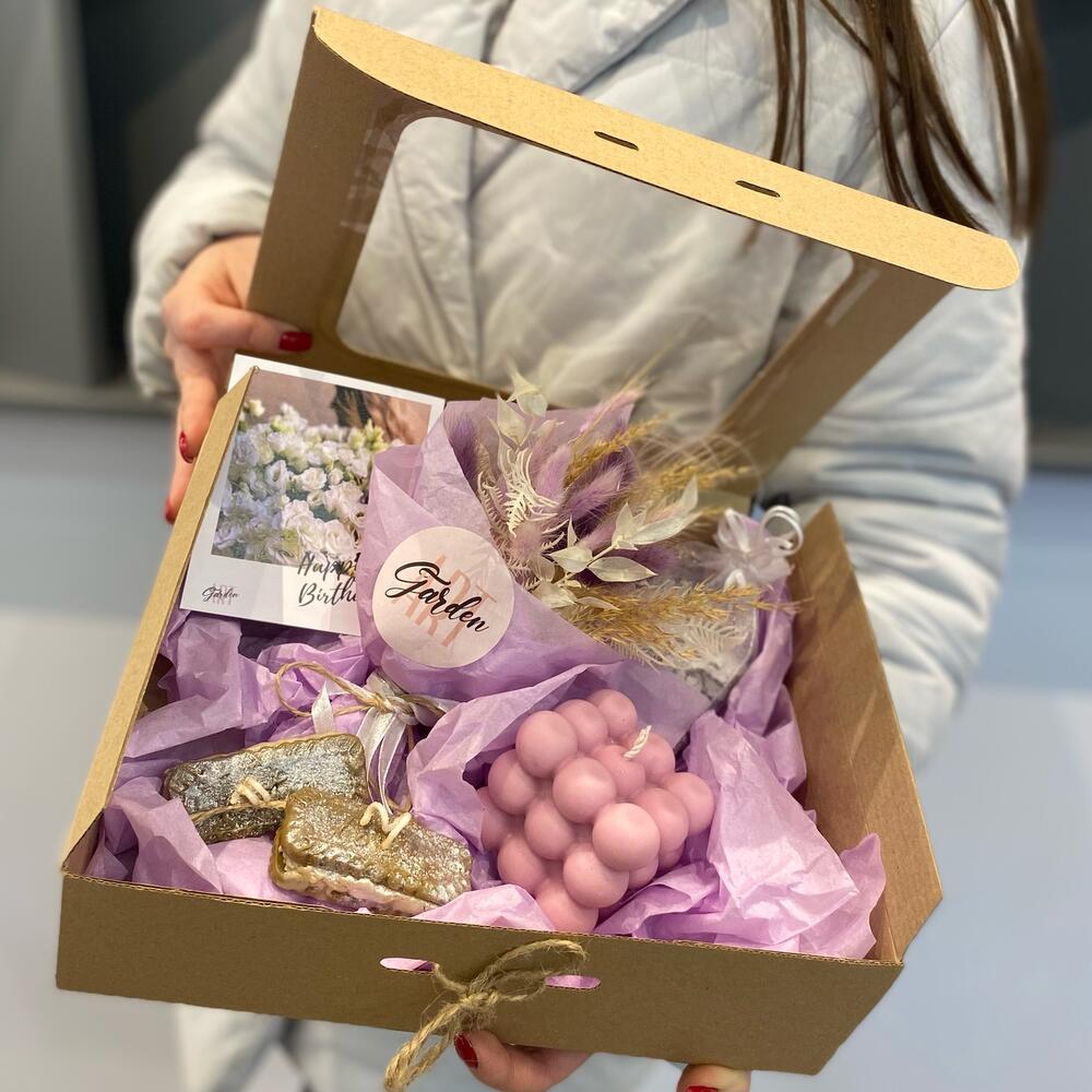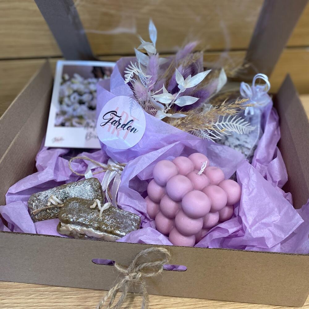 Подарочный бокс с букетом из сухоцветов, свечами ручной работы из соевого воска и аромасаше с лавандой. При желании можно добавить открыточку и подписать ее на обороте. Оформлено все в подарочную крафтовую коробку.