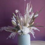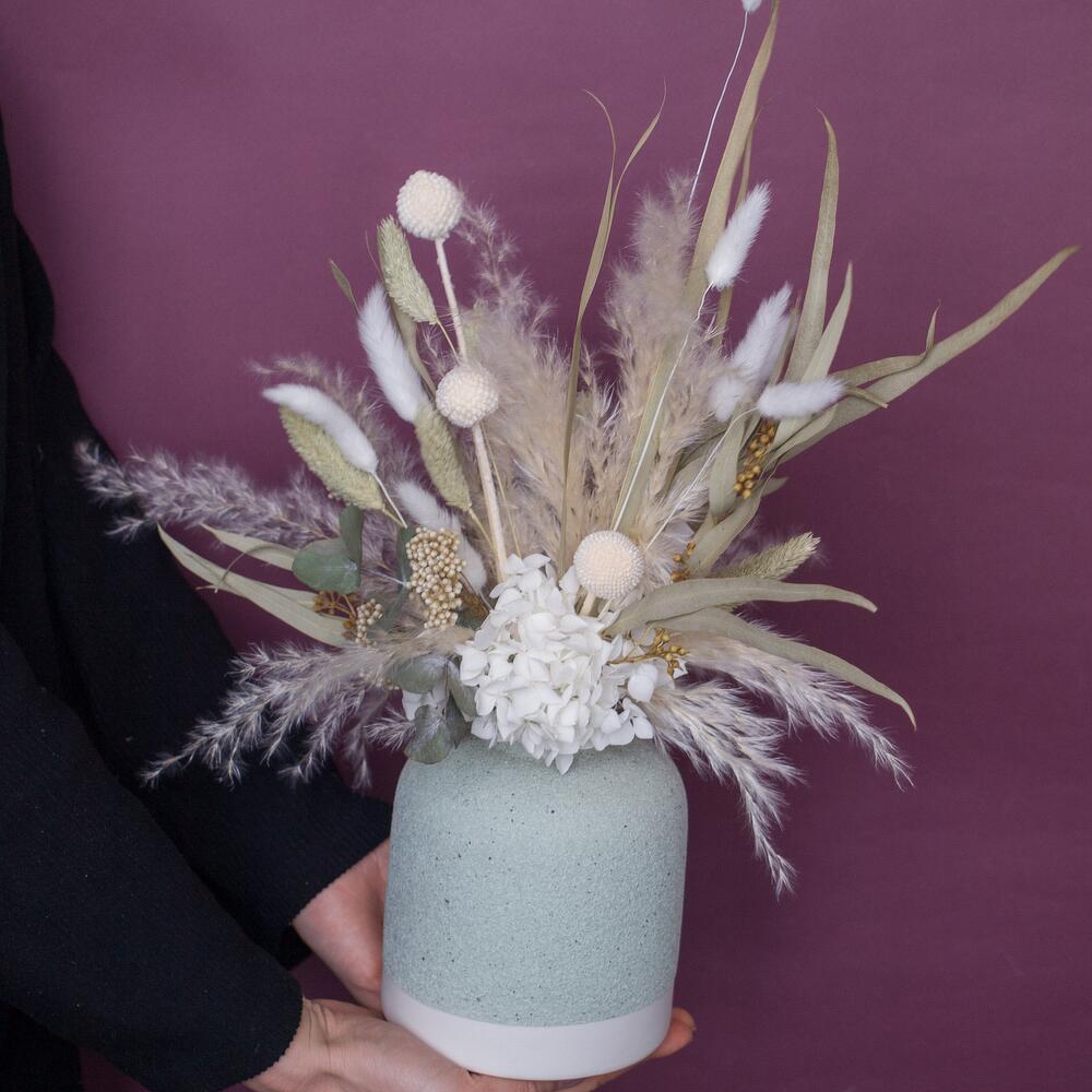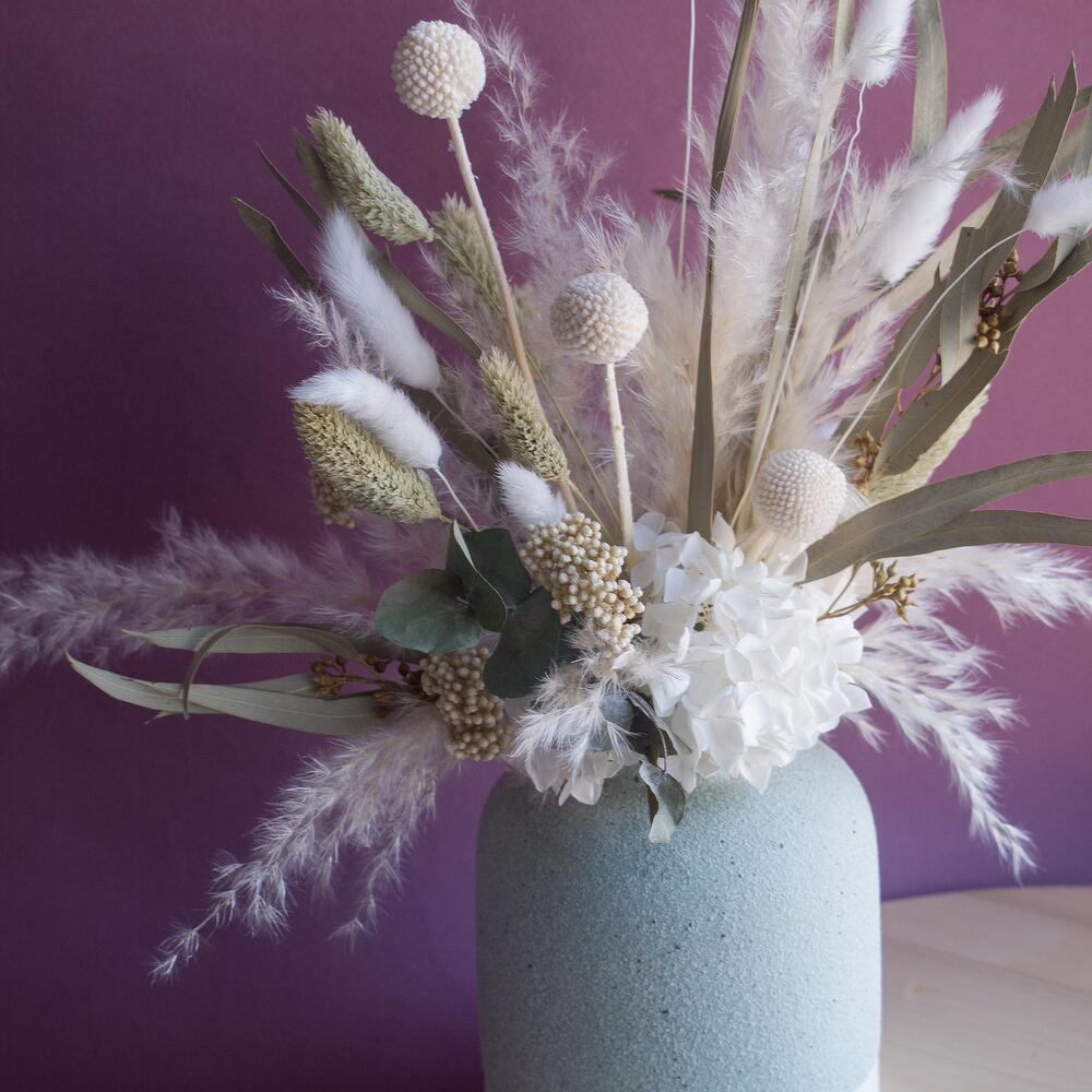 Сухоцветы и стабилизированные цветы в бирюзовой вазе