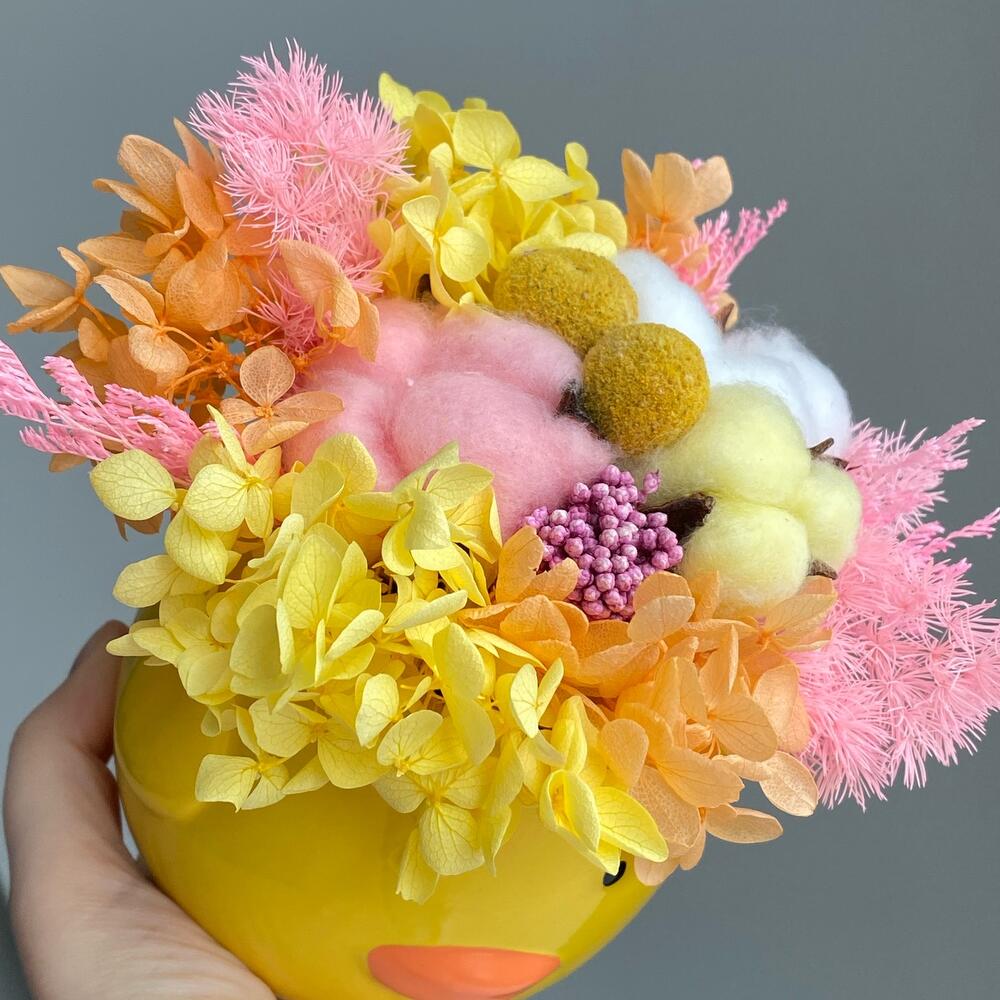 Милый керамический малыш с сухоцветами и стабилизированными цветочками.Цветы не завянут, будут радовать несколько лет.Уход:- водой не поливать- на солнышко и подоконник не ставить