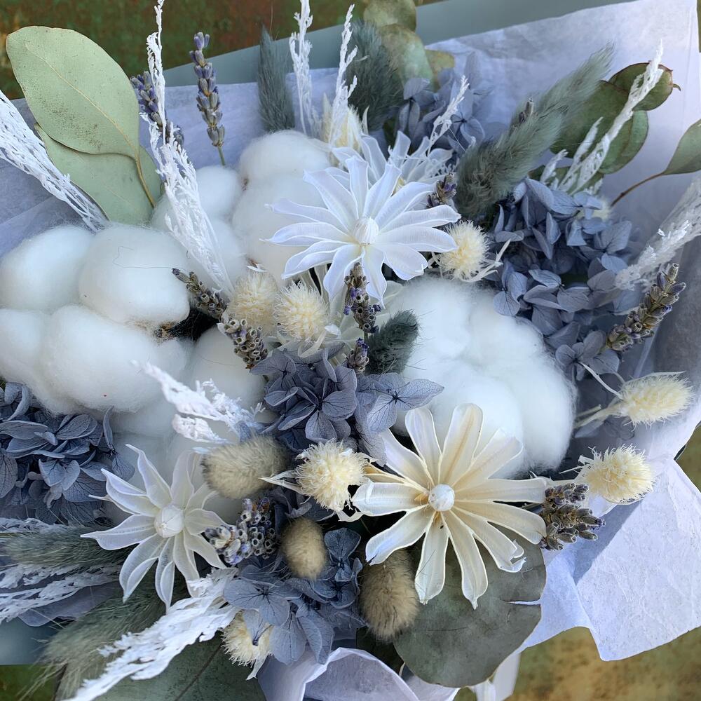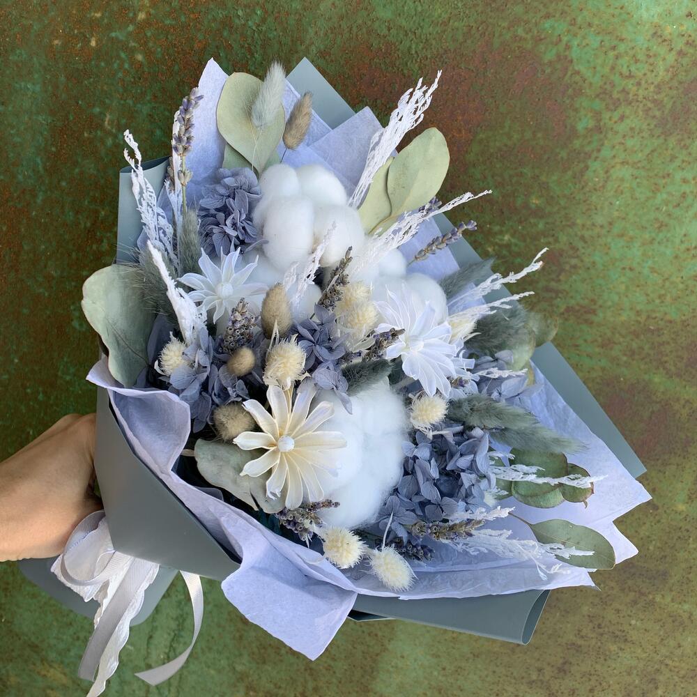 Букет в серо-белой гамме. Немного натурального эвкалипта и лаванды, дают лёгкий аромат. Благородная серая гортензия, хлопок и акцент цветы нигеллы.Букет будет радовать от 2-4 лет.