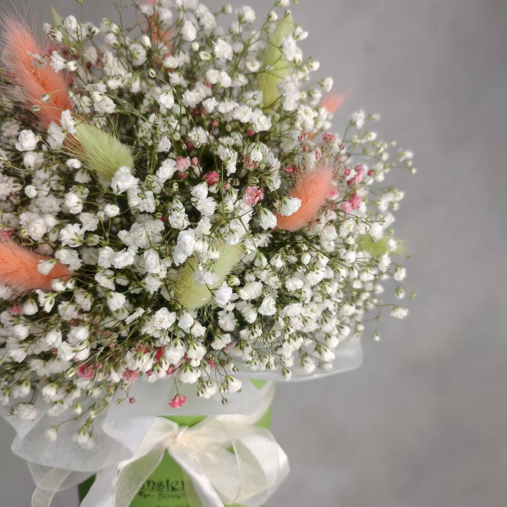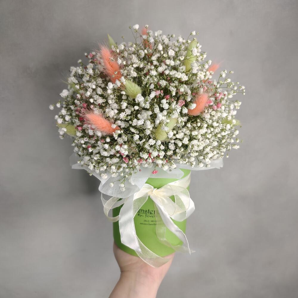 Коробка шляпная – 1 шт.Оазис флористический – 1 шт.Гипсофила – 7 шт.лагурус салатовый – 10 шт.лагурус персиковый – 7 шт.