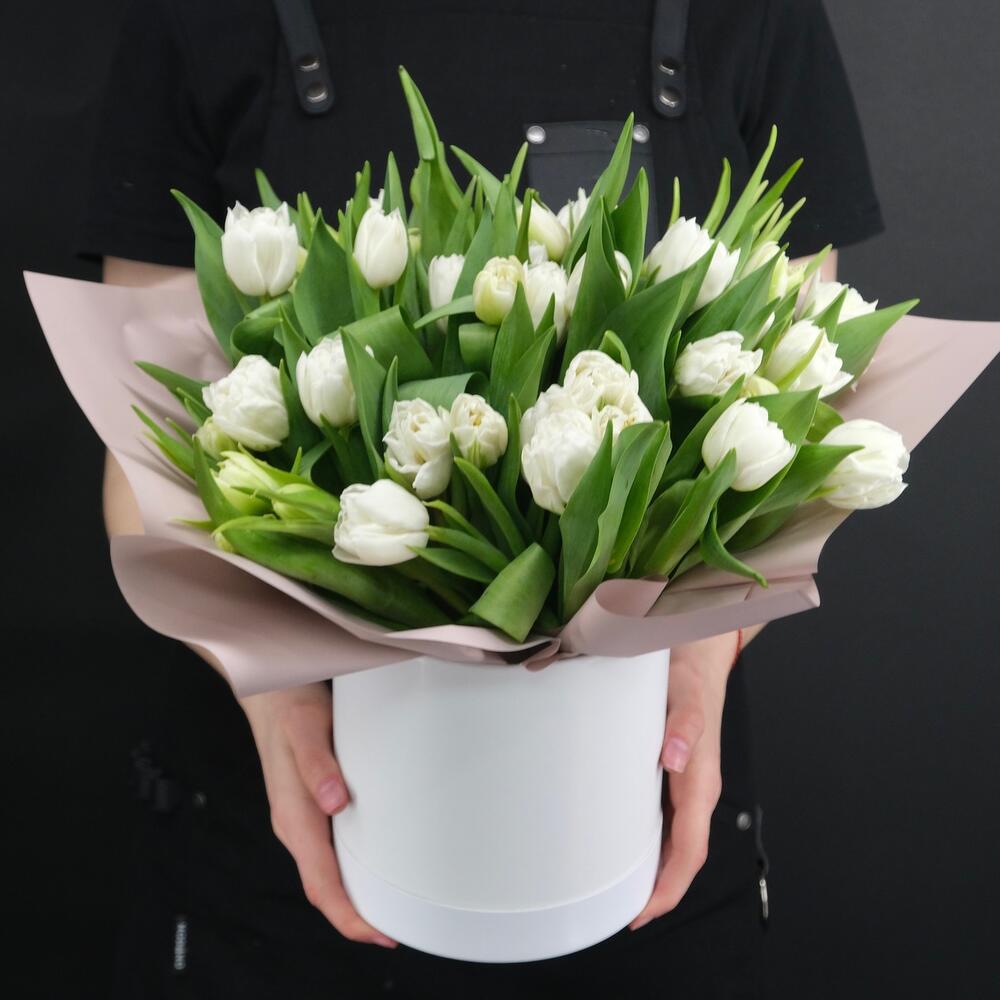 31 белый пионовидный тюльпан в шляпной коробке