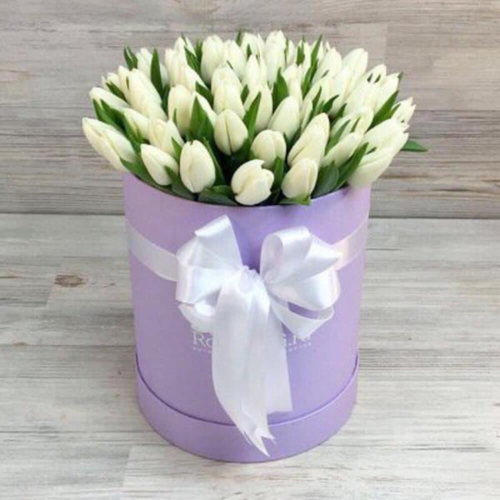 Шляпная коробка – 1 шт.Тюльпан белый – 51 шт.Оазис флористический – 1 шт.