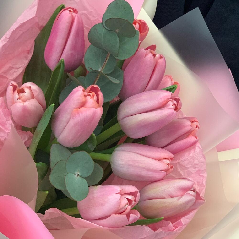 Тюльпан – 11 шт.Эвкалипт – 1 шт.Дизайнерская упаковка – 2 шт.Атласная лента – 1 шт.