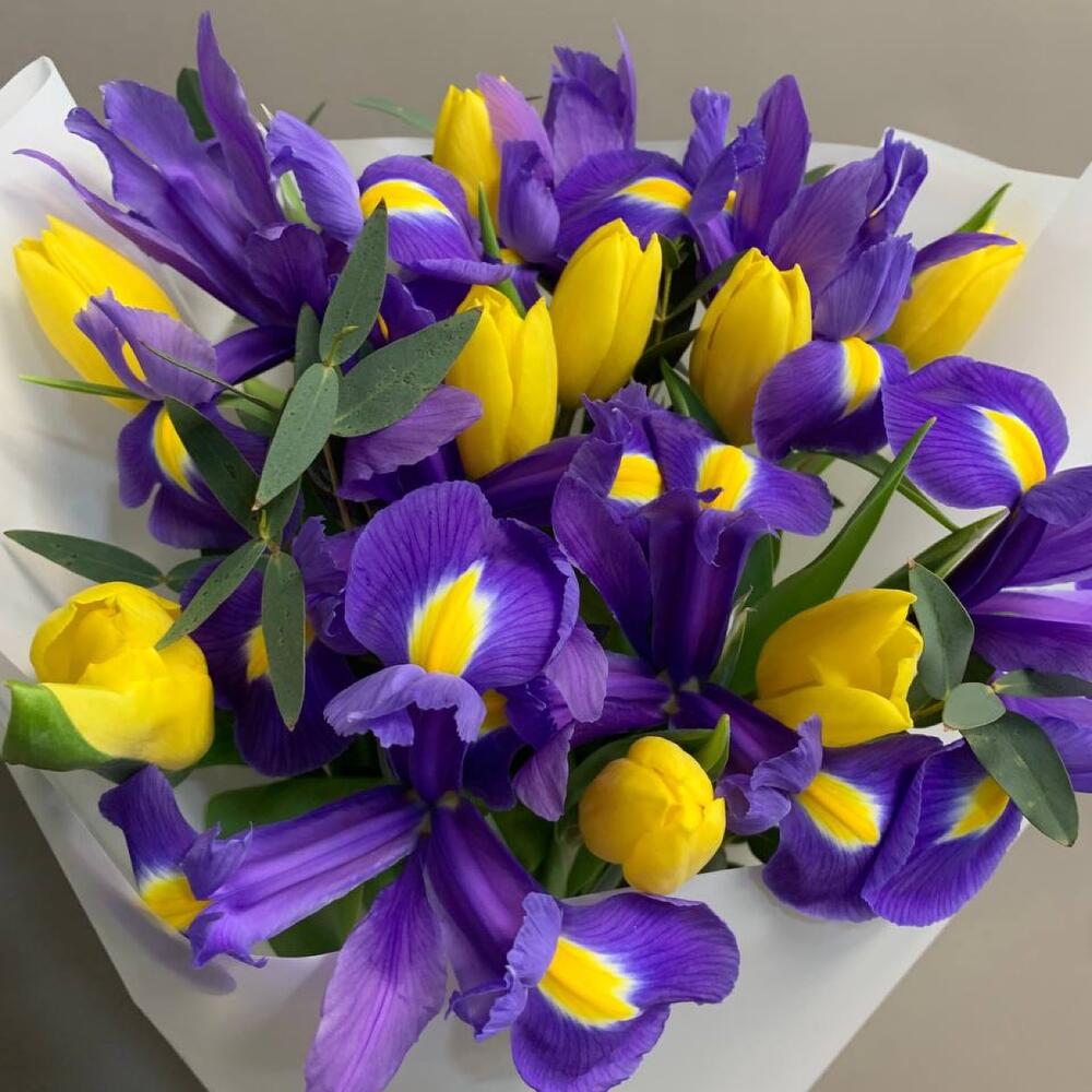 Тюльпан желтый – 8 шт.Ирис – 7 шт.Эвкалипт – 3 шт.Упаковка дизайнерская – 2 шт.Лента атласная – 1 шт.