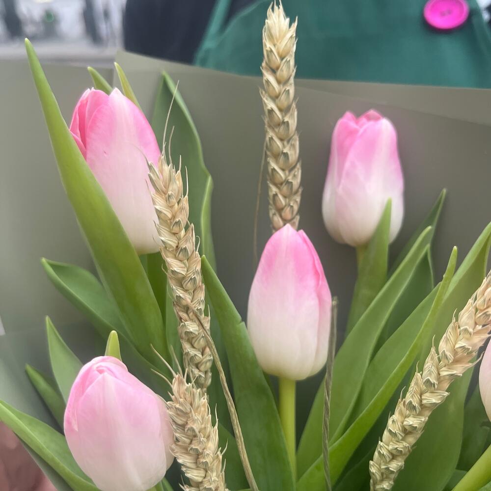 Крафт – 1 шт.Тюльпан розовый – 5 шт.Упаковка корейская пленка – 1 шт.Лента атласная нежно-розовая – 1 шт.бечевка натуральная – 1 шт.пшеница сухоцвет – 5 шт.