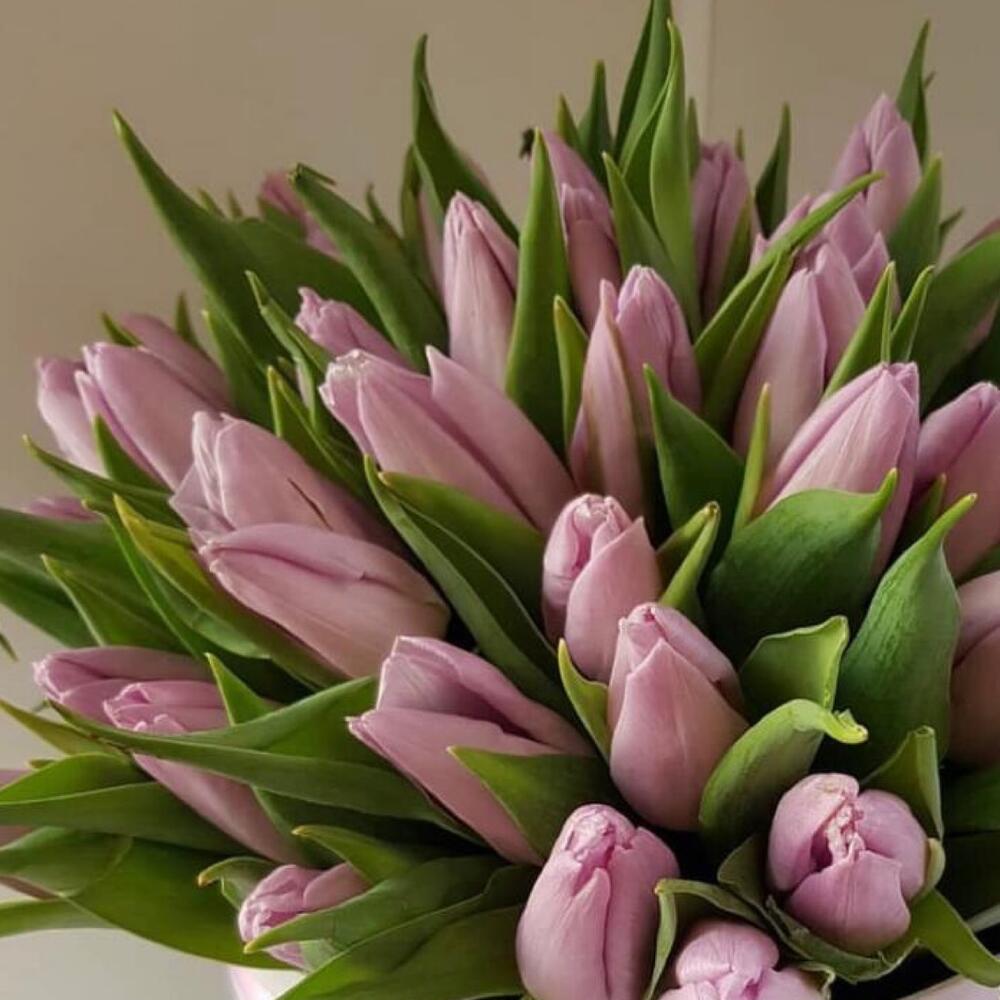 Тюльпан розовый – 51 шт.Коробка шляпная – 1 шт.Лента атласная – 2 шт.Открыточка с вашими пожеланиями – 1 шт.хорошее настроение – 100 шт.инструкция по уходу за цветами – 1 шт.Кризал – 1 шт.