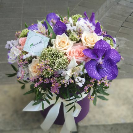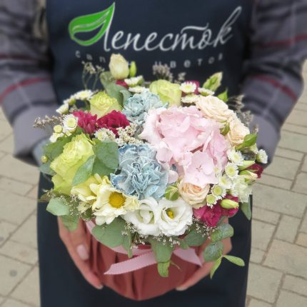 Бархатный цилиндр из голубых диантусов, розовых пионов и ароматной маттиолы